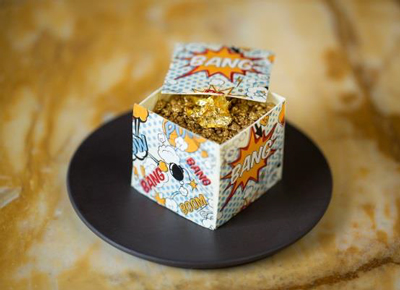 Sarah’s playful, contemporary style will also be highlighted by the Wham Bam Pow, consisting of a chocolate box filled with an olive oil biscuit, passion and ginger pâte de fruit, chocolate popping candy, and whipped ganache.