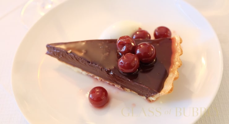 Chocolate tart, créme fraiche and griottines – paired with Rosé de Saignée: “The Saignée really cleanses the mouth of this very sweet, more’ish and sticky chocolate dish and tempts you into another spoon full – Here the Saignée works far better for me.”